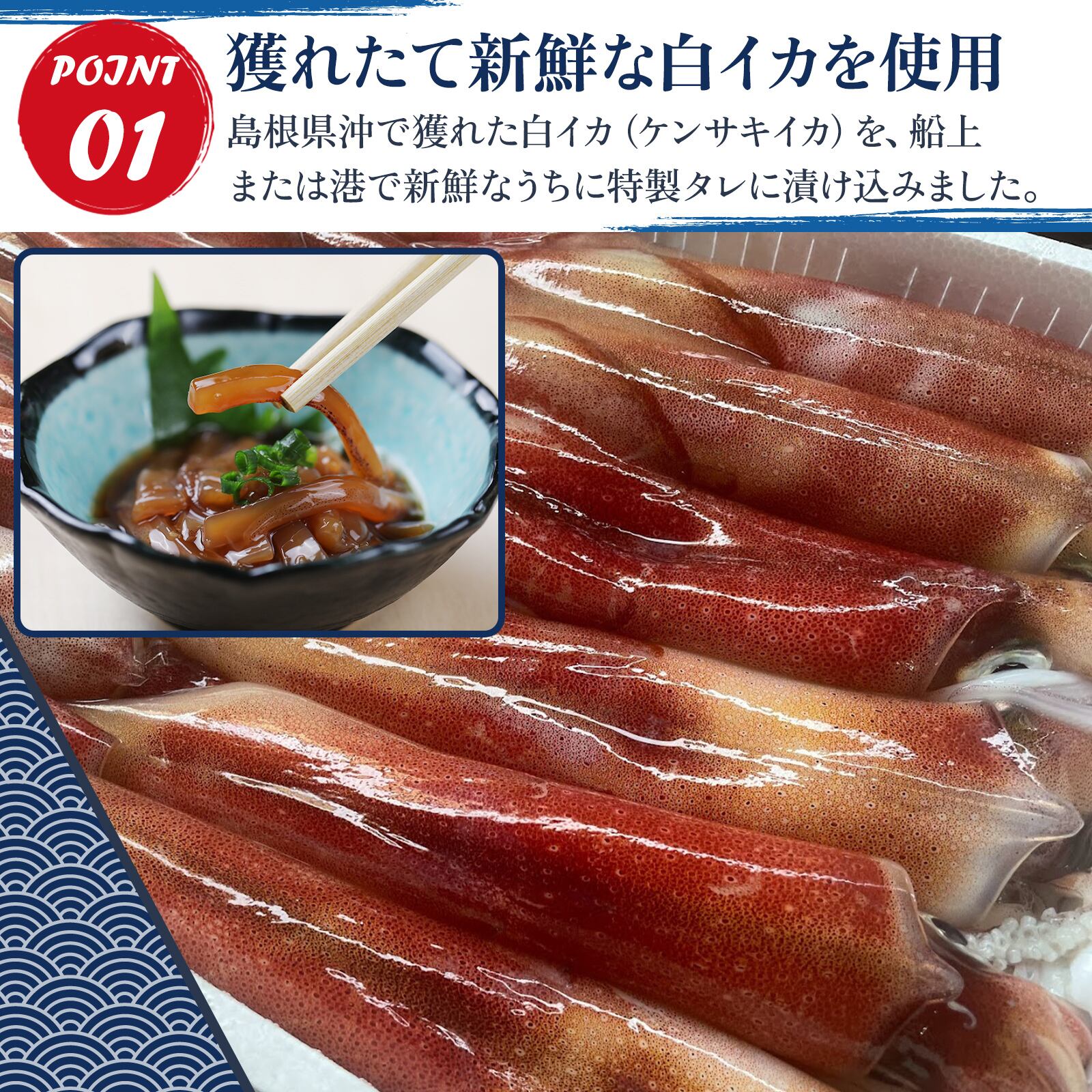 島根県沖で獲れた白イカ(ケンサキイカ)を船上、または港ですぐに漬け込んだ海彦特製の沖漬けです。